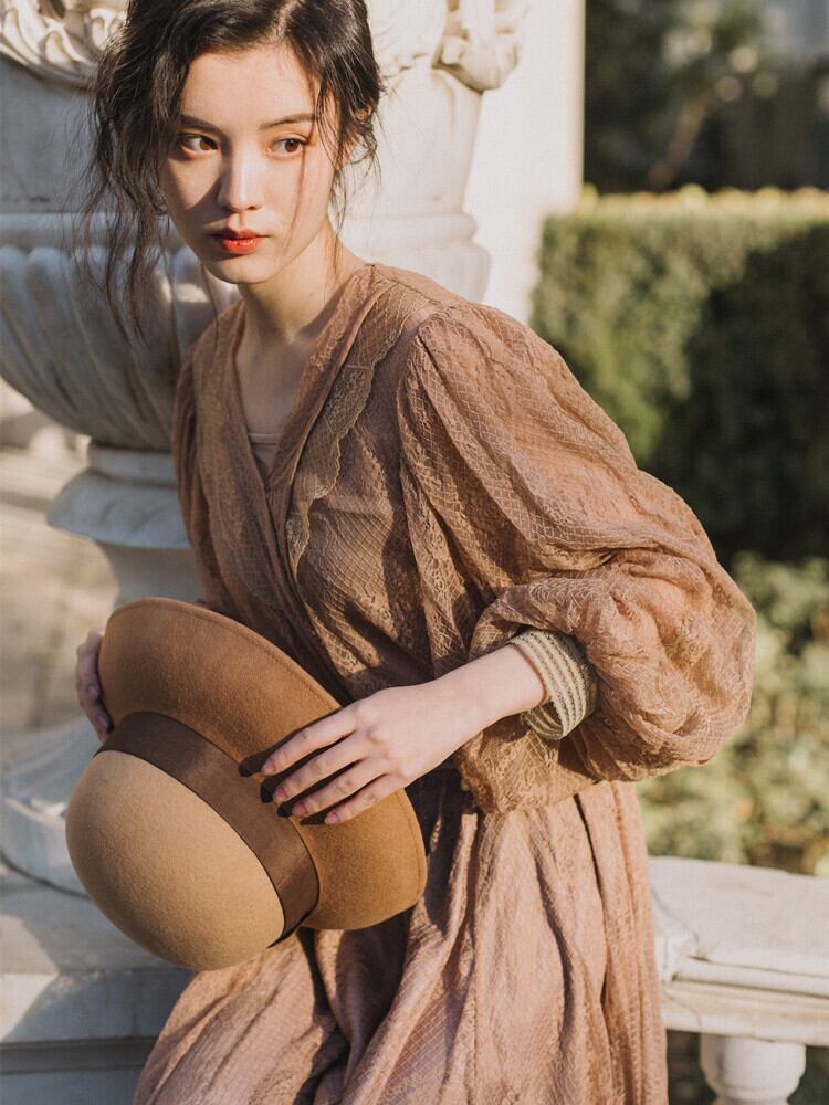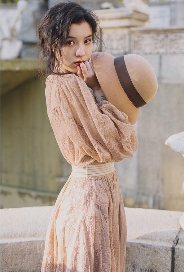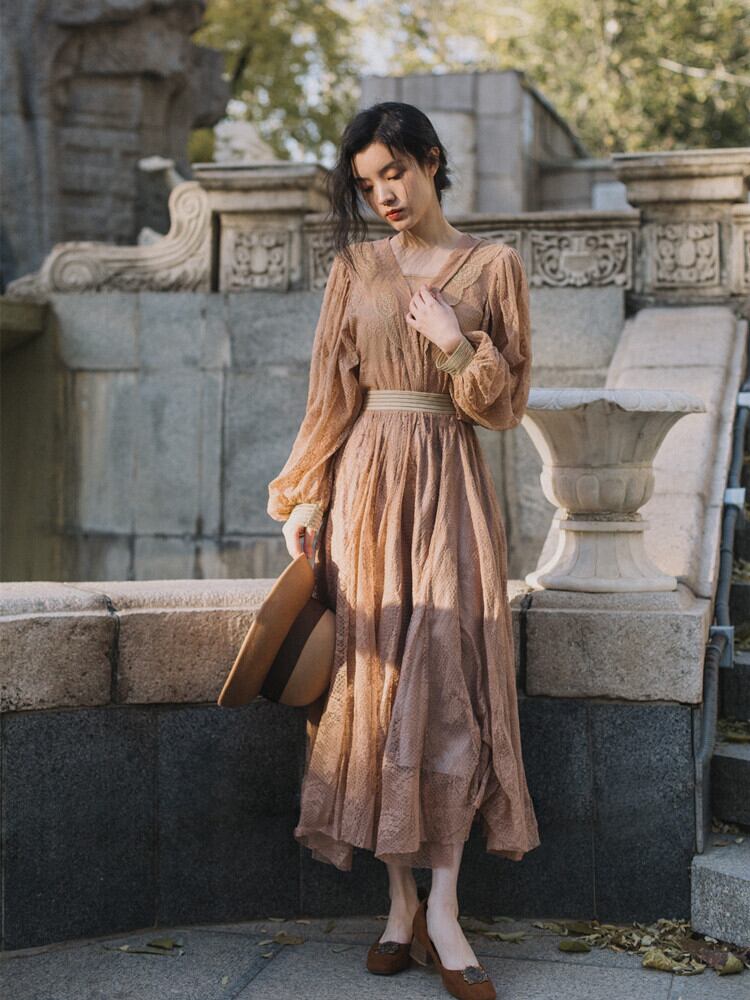 ワンピース レース ワンピドレスロング丈 長袖 ボリューム袖 Vネック フリル ウエストマーク かわいい 大人可愛い 無地 春 秋 大人 上品 おしゃれ お洒落 大人女子 こなれ感 キュート ルーズ 抜け感 S M L ベージュ 10代 20代 デート お出かけ 女子会 休日 パーティー イベント 旅行 ファッション コーデ 送料無料 | Rena 韓国ファッション レディースアパレル