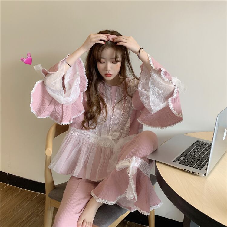 ルームウェア パジャマ 部屋着 ナイトウェア レディース 長袖 襟なし レース フリル 上下セット 2点セット かわいい おしゃれ お洒落 ラブリー キュート ガーリー フリーサイズ 白 ホワイト ベージュ ピンク オレンジ 春 秋 10代 学生 お泊まり 休日 ファッション コーデ 送料無料 | Rena 韓国ファッション レディースアパレル