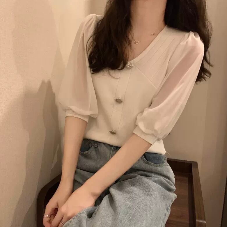 レディース トップス Tシャツ 白トップス 袖あり 半袖 5分袖 パフスリーブ Vネック 切り替えデザイン ボタン フロントボタン 透け感 シースルー 薄手 異素材MIX 大人可愛い きれいめ シンプル カジュアル 大人 おしゃれ レトロ 大人女子 こなれ感 ガーリー S M L ホワイト ブラック ベージュ 無地 春 夏 2021 10代 20代 30代 女性用 ママ OL 通勤 学生 通学 デート お出かけ 公園デビュー 女子会 休日 韓国系 オルチャン モテ 新作 送料無料