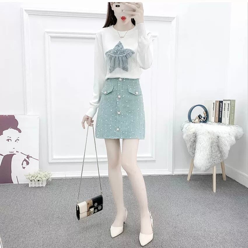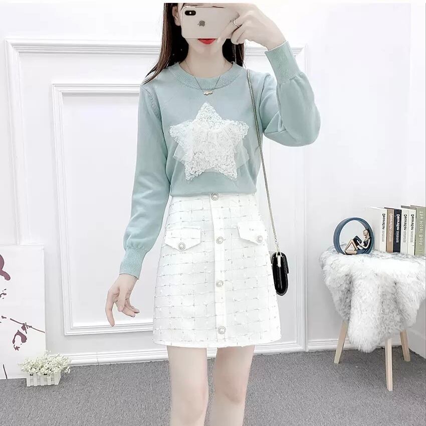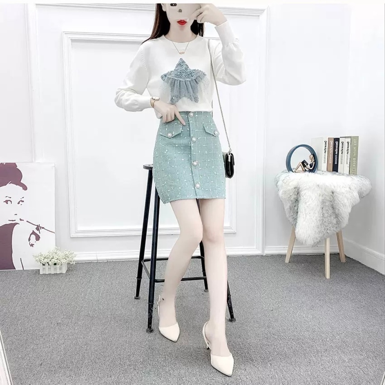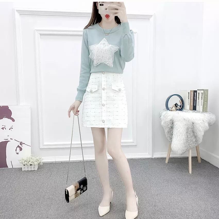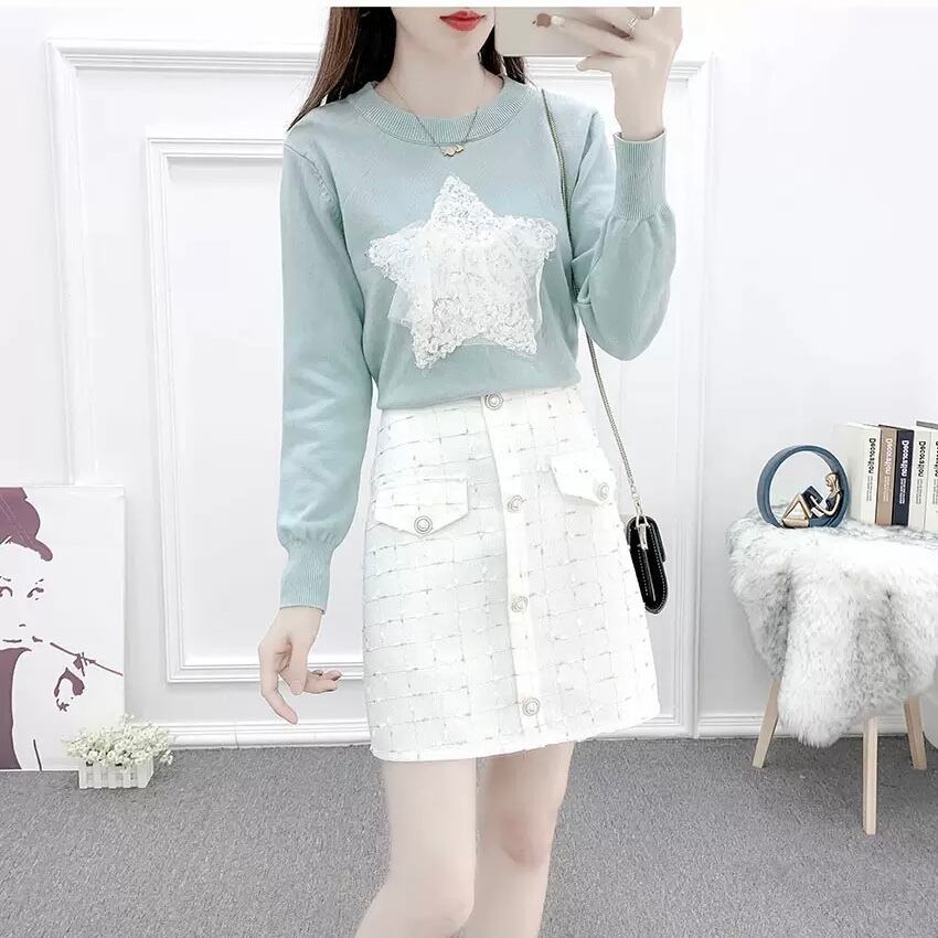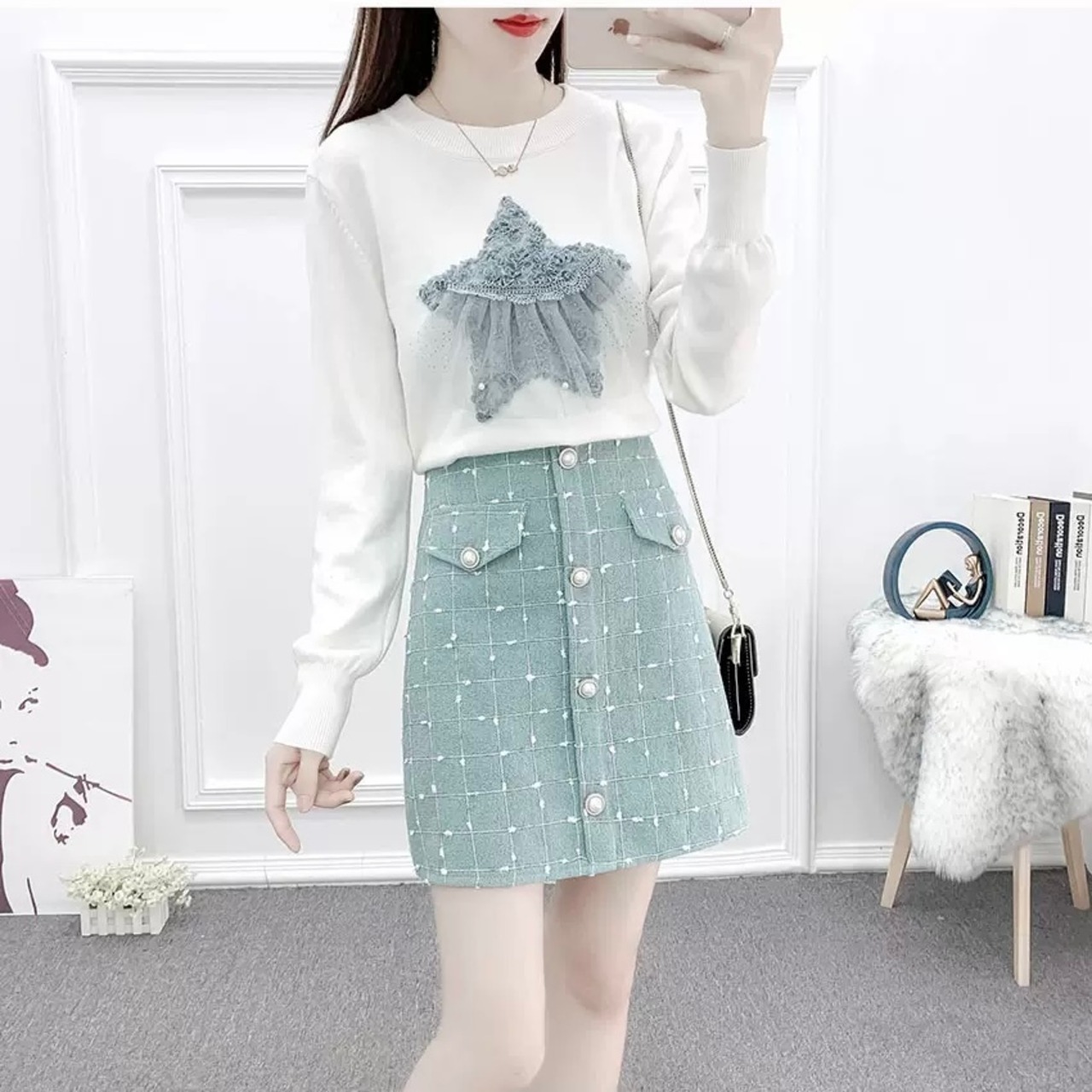 レディース トップス スカート セットアップ Tシャツ 白トップス ペンシルスカート ショート ショート丈 袖あり 長袖 ラウンドネック レース 刺繍 ハイウエスト パール 星 2点セット ツーピース かわいい 大人可愛い 大人 おしゃれ ラブリー キュート S M L XL ホワイト グリーン ピンク パステルカラー 柄 チェック柄 春 秋 2021 10代 20代 女性用 ママ 学生 通学 デート お出かけ 女子会 休日 リゾート 旅行 モテ 美脚 脚長 新作 送料無料 | Rena 韓国ファッション レディースアパレル