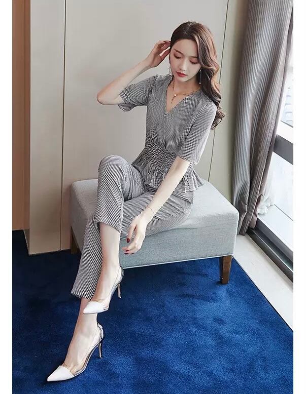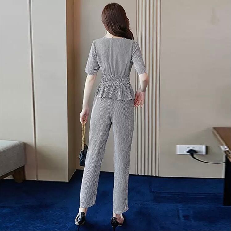 レディース トップス ボトムス パンツ セットアップ クロップドパンツ 9分丈 アンクル丈 袖あり 半袖 Vネック 襟なし スリム シャーリング 裾フレア ハイウエスト ポリエステル 上下セット 2点セット ツーピース お得 きれいめ 大人 おしゃれ お洒落 S M L XL ブラック 柄 夏 2021 10代 20代 女性用 ママ オフィス OL 通勤 コーデ 新作 送料無料 | Rena 韓国ファッション レディースアパレル