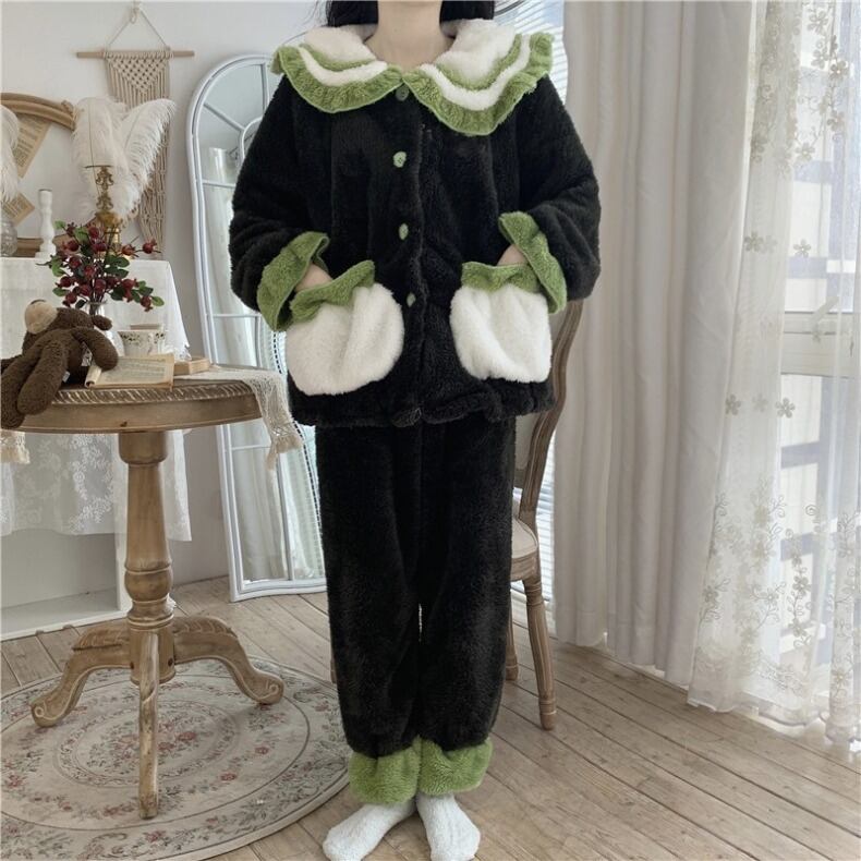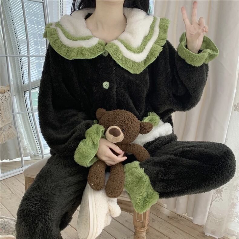 レディース ルームウェア パジャマ 長袖 リボン もこもこ モコモコ 上下セット 2点セット かわいい おしゃれ お洒落 メンズライク ラブリー キュート 黒 ブラック 秋 冬 10代 20代 お泊まり 休日 普段使い 送料無料 | Rena 韓国ファッション レディースアパレル