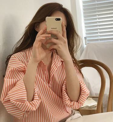 レディース トップス シャツ ストライプ 袖あり 襟付き かわいい 大人可愛い カジュアル 大人 おしゃれ お洒落 大人可愛い 大人女子 S M L 青 ブルー オレンジ 春 夏 10代 20代 30代 オフィス ビジネス OL 通勤 デート お出かけ 女子会 ファッション コーデ 送料無料 | Rena 韓国ファッション レディースアパレル