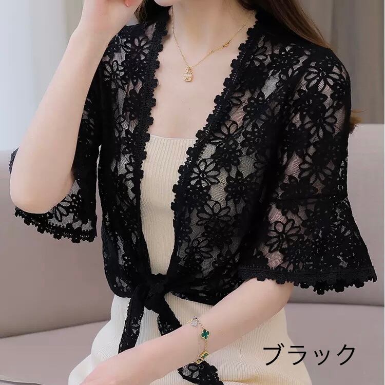 ボレロ カーディガン レース ショート丈 半袖 5分袖 Vネック リボン 前開き 透け感 シースルー 薄手 かわいい 大人可愛い 大人 上品 おしゃれ メンズライク キュート ガーリー セクシー エレガント フォーマル S M L XL 2XL ホワイト ブラック 大人カラー 柄 花柄 小花柄 フラワー 夏 2021 10代 20代 女性用 ママ 学生 通学 デート お出かけ 女子会 休日 パーティー イベント リゾート 旅行 韓国系 コーデ モテ 新作 送料無料 | Rena 韓国ファッション レディースアパレル