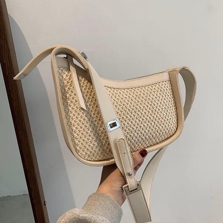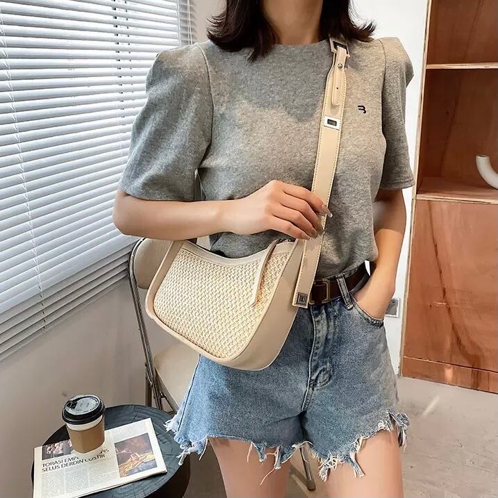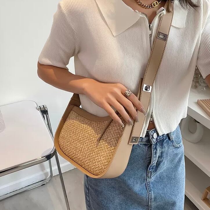 夏らしいストロー素材とフェイクレザーを使用したバッグです。