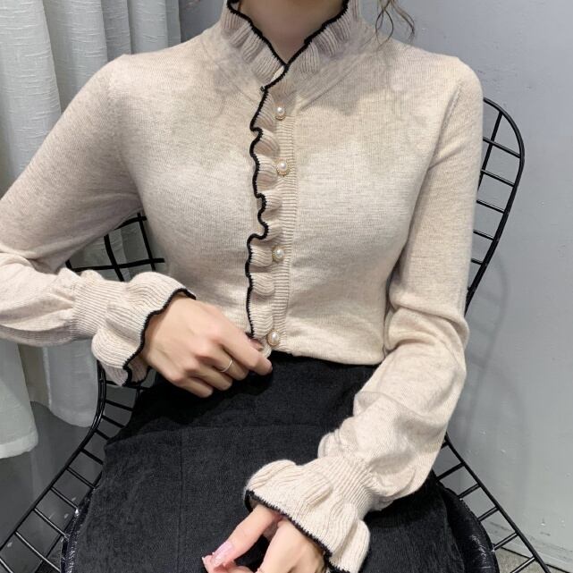 ニット カーディガン レディース トップス 長袖 秋 冬 フリル かわいい 大人可愛い 大人 おしゃれ お洒落 大人可愛い 大人女子 S M L XL カーキ 春 秋 10代 20代 30代 デート お出かけ 女子会 休日 旅行 送料無料 | Rena 韓国ファッション レディースアパレル