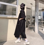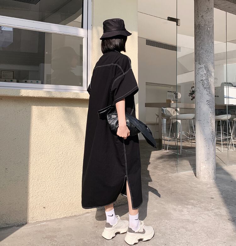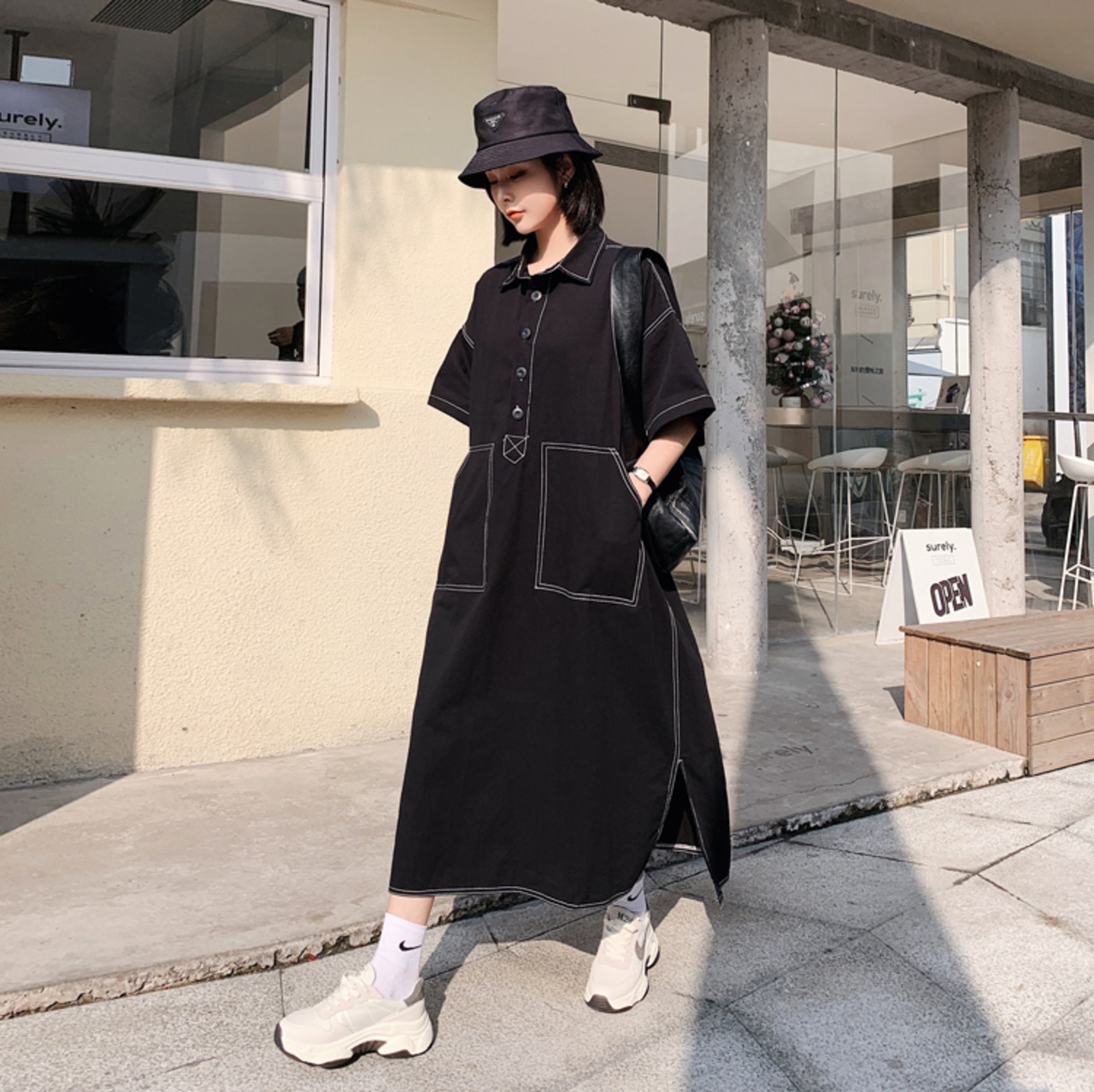 ワンピース シャツワンピース ロング丈 ミモレ丈 半袖 Vネック 襟付き ワイド Iライン スリット かわいい 大人可愛い きれいめ シンプル カジュアル おしゃれ お洒落 かっこいい 大人可愛い 大人女子 こなれ感 ラフ ルーズ 存在感 抜け感 L XL 2XL 3XL 黒 ブラック 緑 グリーン 無地 夏 20代 30代 学生 通学 デート お出かけ 女子会 休日 イベント 着回し 韓国 韓国系 コーデ スタイル 楽ちん モテ 新作 送料無料 トレンド 流行 インスタ映え | Rena 韓国ファッション レディースアパレル