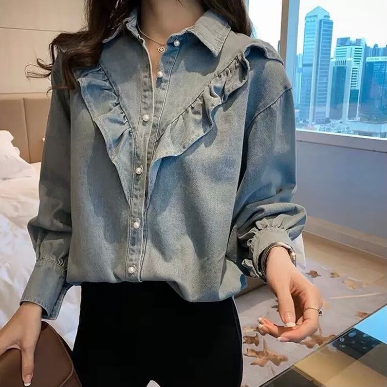 ブラウス シャツ デニム レディース 長袖 ドロップショルダー 襟付き フリル ラウンドカット パールボタン 前開き 大人可愛い カジュアル 大人 おしゃれ 大人女子 メンズライク ガーリー 個性的 M L XL 2XL 3XL 4XL 大きいサイズ ブルー 無地 春 秋 2020 10代 20代 女性用 ママ 通勤 学生 通学 デート お出かけ 公園デビュー 女子会 休日 韓国系 オルチャン モテ 新作 送料無料 | Rena 韓国ファッション レディースアパレル