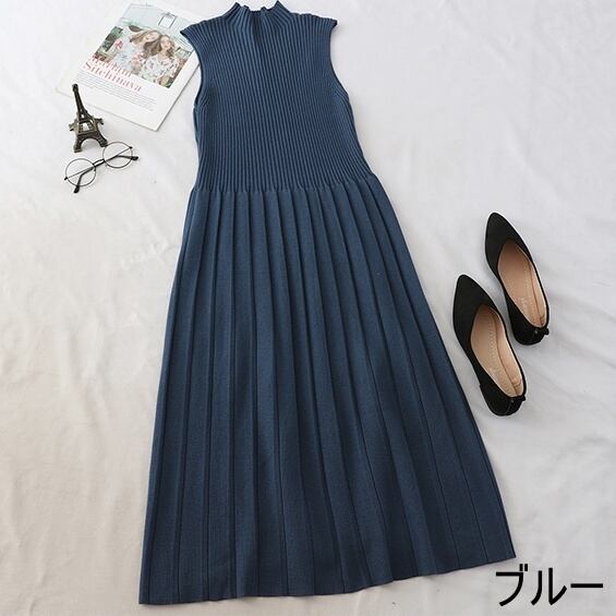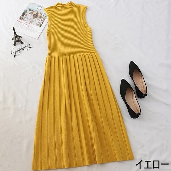ワンピース ニット ロング丈 ノースリーブ ハイネック Aライン プリーツ かわいい 大人可愛い きれいめ 大人 上品 おしゃれ 大人女子 エレガント フリーサイズ 黒 ブラック 青 ブルー 緑 グリーン 茶色 ブラウン 黄色 オフホワイト ベージュ イエロー 秋 10代 20代 30代 40代 女性用 デート お出かけ 公園デビュー 女子会 お泊まり 休日 着回し 普段使い ファッション コーデ モテ 送料無料 | Rena 韓国ファッション レディースアパレル