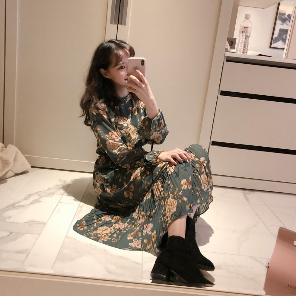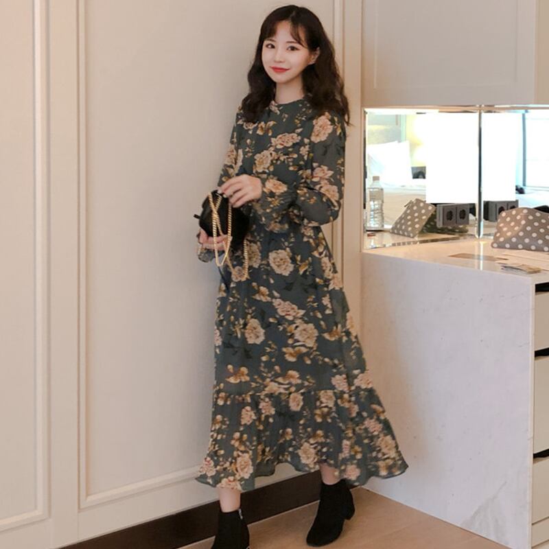 ワンピース ロング丈 長袖 シフォン 花柄 レトロ 春 秋 かわいい 大人可愛い きれいめ 大人 上品 おしゃれ お洒落 大人女子 エレガント 主役級 存在感 S M L XL 緑 グリーン 10代 20代 30代 デート お出かけ 公園デビュー 女子会 休日 リゾート 旅行 着回し 普段使い ファッション コーデ モテ 送料無料 インスタ映え | Rena 韓国ファッション レディースアパレル