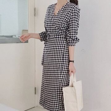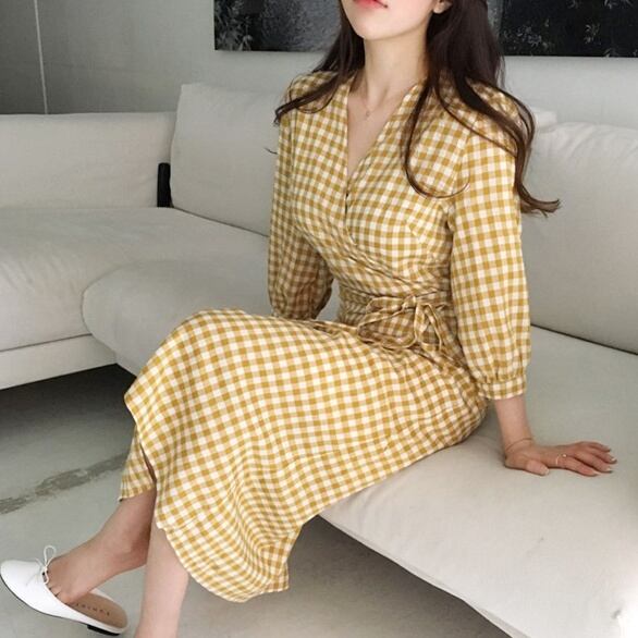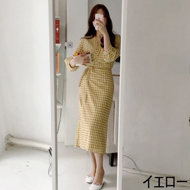 ワンピース ギンガムチェック ミディアム丈 七分袖 Vネック タイト かわいい 大人可愛い きれいめ シンプル 大人 上品 おしゃれ お洒落 大人女子 ラフ キュート エレガント 主役級 S M L XL 黒 ブラック 黄色 イエロー チェック柄 春 秋 10代 20代 30代 40代 女性用 デート お出かけ 公園デビュー 女子会 休日 イベント リゾート 旅行 海 プール 着回し 普段使い コーデ スタイル 楽ちん モテ 送料無料 | Rena 韓国ファッション レディースアパレル