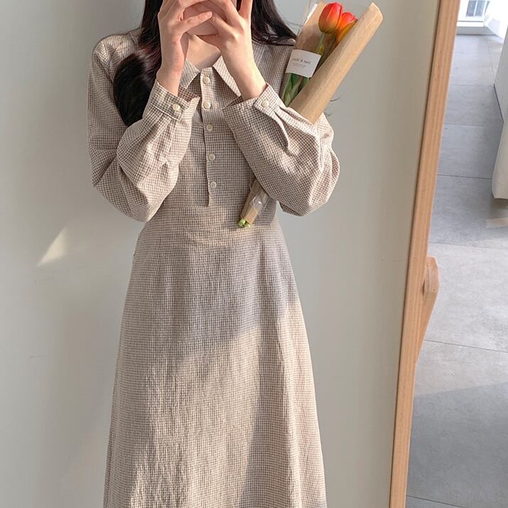 ワンピース 膝下 長袖 襟付き かわいい 大人可愛い 清楚 きれいめ シンプル 大人 上品 おしゃれ お洒落 大人女子 キュート エレガント S M L XL チェック柄 春 秋 10代 20代 30代 40代 女性用 デート お出かけ 公園デビュー 女子会 休日 リゾート 旅行 海 プール 着回し 普段使い ファッション コーデ モテ 送料無料 | Rena 韓国ファッション レディースアパレル