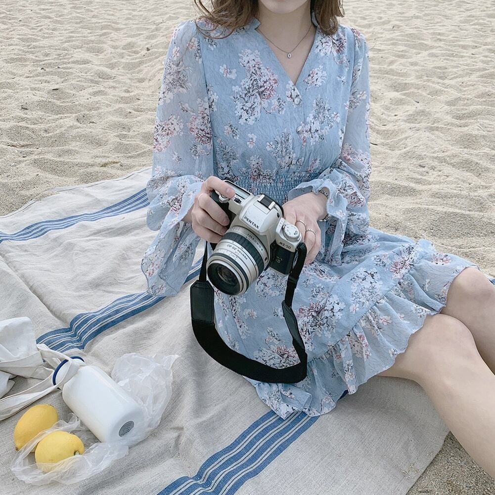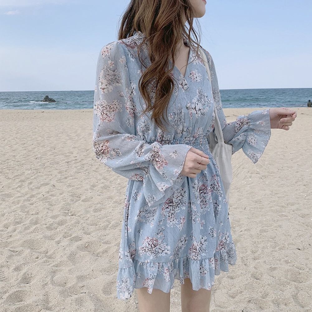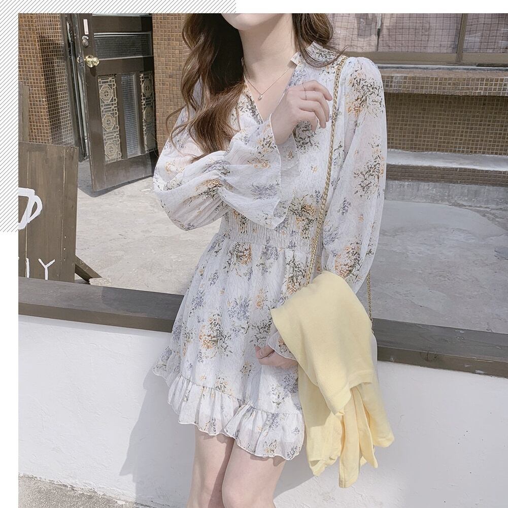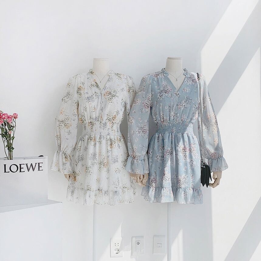 ワンピース ミニ丈 長袖 シフォン フリル袖 花柄 春 秋 水色 ホワイト かわいい おしゃれ お洒落 大人可愛い メンズライク キュート S M L XL 白 青 ブルー 10代 20代 30代 デート お出かけ 女子会 休日 旅行 ファッション コーデ モテ 送料無料 | Rena 韓国ファッション レディースアパレル