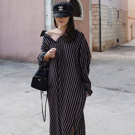 縦ストライプのシャツロングワンピースです。
