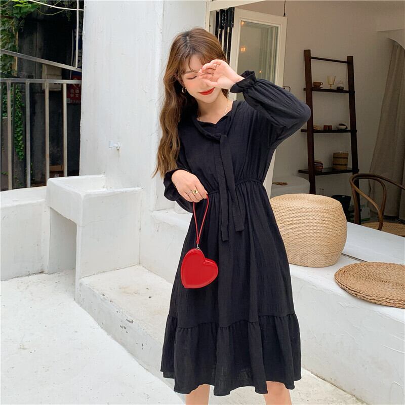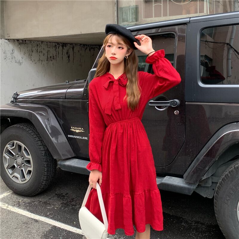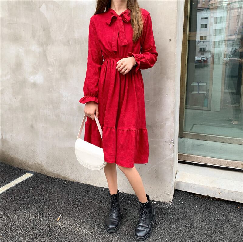 レディース ワンピース フレアワンピース ひざ丈 袖あり 長袖 フレア リボン ウエストゴム かわいい 大人可愛い きれいめ シンプル カジュアル 大人 上品 おしゃれ 大人女子 こなれ感 ラフ ラブリー キュート ガーリー エレガント フリーサイズ 黒 レッド 大人カラー 無地 春 秋 10代 20代 30代 40代 50代 60代 OL 通勤 学生 通学 デート お出かけ 女子会 休日 旅行 着回し 普段使い ファッション コーデ スタイル モテ 送料無料 | Rena 韓国ファッション レディースアパレル