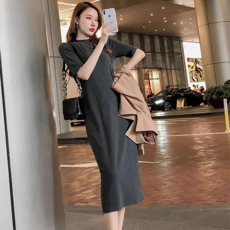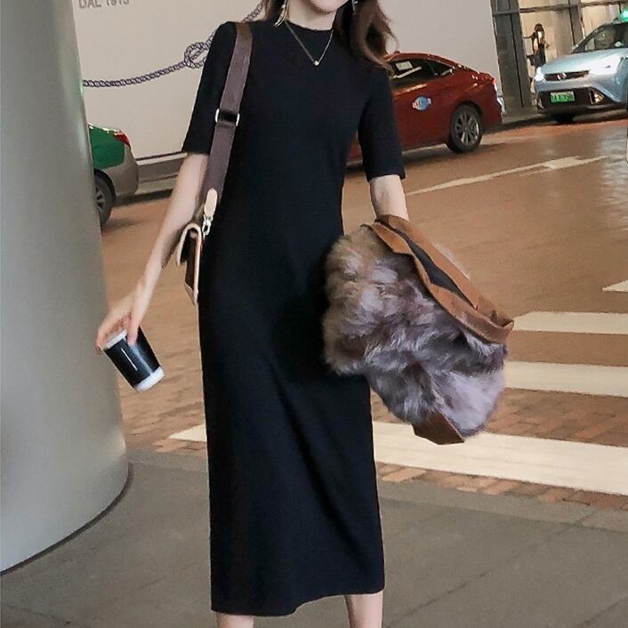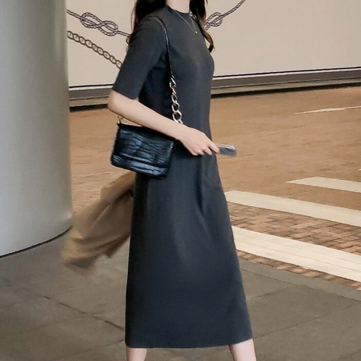 ワンピース Tシャツ ニット Tシャツワンピース ひざ下 半袖 無地 秋 冬 タイト かわいい 大人可愛い きれいめ シンプル カジュアル 大人 上品 おしゃれ お洒落 大人女子 ラフ クール エレガント 袖あり ニット 黒 ブラック 灰色 グレー S M L XL 2XL 3XL 10代 20代 30代 40代 女性用 通勤 学生 通学 デート お出かけ 公園デビュー 女子会 お泊まり 休日 ジム 着回し 普段使い ファッション コーデ 楽ちん モテ 送料無料 | Rena 韓国ファッション レディースアパレル
