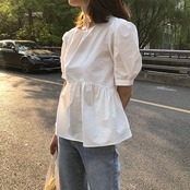 ブラウス 半袖 無地 夏 かわいい 大人可愛い きれいめ シンプル カジュアル 大人 上品 おしゃれ お洒落 大人女子 ラフ キュート エレガント ラウンドネック 袖あり パフスリーブ 白 ホワイト 青 ブルー M L XL 2XL 10代 20代 30代 女性用 ママ オフィス ビジネス OL 通勤 学生 通学 デート お出かけ 公園デビュー 女子会 休日 着回し 普段使い ファッション コーデ モテ 送料無料