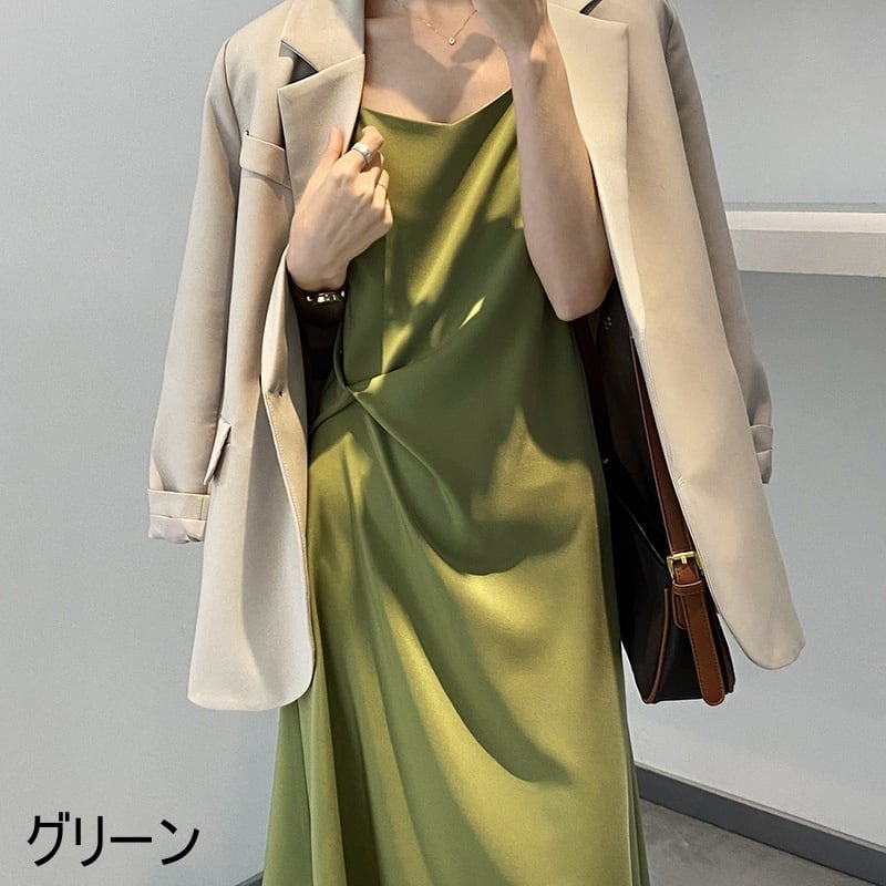シンプルなデザインのキャミソールタイプのロングワンピースです。細めのシルエットで上品な雰囲気がでそうな一品です。ワンピースの上にジャケットを羽織ってもオシャレ感が増しそう!気分に合わせて違う色味を楽しめる3色展開です。