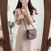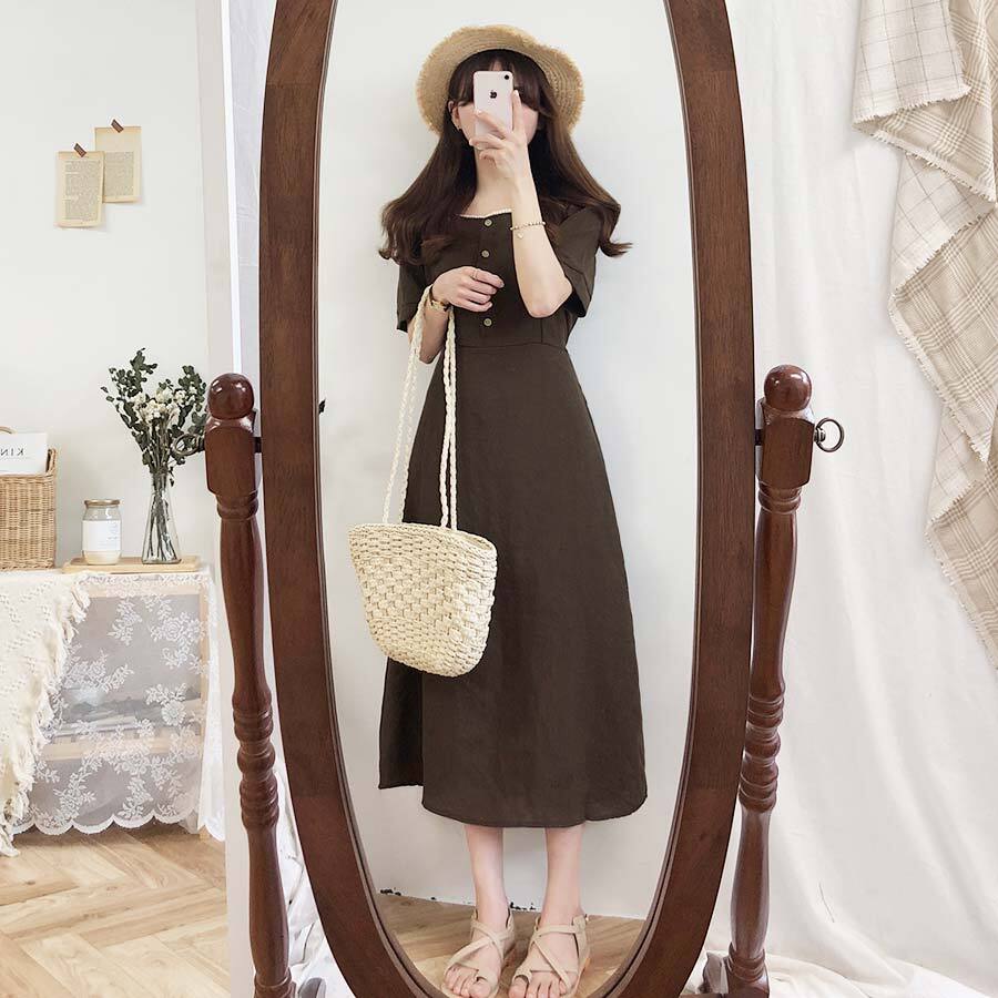 ワンピース ロング丈 半袖 ボリューム袖 パフスリーブ スクエアネック 襟なし スリム 大人可愛い シンプル おしゃれ お洒落 レトロ 大人可愛い 大人女子 こなれ感 ガーリー S M L XL 茶色 ブラウン ピンク 無地 春 夏 20代 30代 お出かけ 休日 旅行 普段使い ファッション コーデ スタイル モテ 送料無料 | Rena 韓国ファッション レディースアパレル