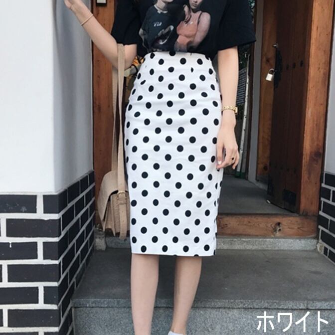 スカート タイトスカート ミディアム丈 タイト ハイウエスト ドット 水玉 かわいい 大人可愛い きれいめ 大人 上品 おしゃれ お洒落 ガーリー エレガント S M L XL 白 ホワイト 黒 ブラック 春 夏 10代 20代 30代 女性用 デート お出かけ 公園デビュー 女子会 休日 イベント 旅行 海 プール 着回し 普段使い ファッション コーデ 防寒 体系カバー 美脚 脚長 送料無料