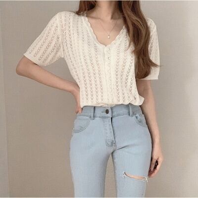 カットソー ニット 半袖 無地 夏 前開き ケーブルニット かわいい 大人可愛い きれいめ シンプル カジュアル 大人 上品 おしゃれ お洒落 大人可愛い 大人女子 こなれ感 ラフ キュート とろみ感 Vネック ニット 白 ホワイト 黒 ブラック ピンク くすみカラー S L 20代 30代 オフィス ビジネス OL 通勤 学生 通学 デート お出かけ 公園デビュー 着回し 普段使い 韓国 韓国系 オルチャン ファッション コーデ スタイル 楽ちん モテ 新作 定番 送料無料 トレンド 流行 インスタ映え | Rena 韓国ファッション レディースアパレル
