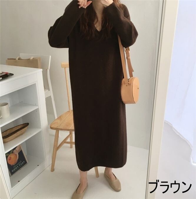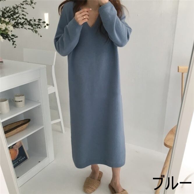 ワンピース ニット ロング丈 無地 秋 冬 かわいい 大人可愛い きれいめ シンプル 大人 上品 おしゃれ お洒落 大人女子 こなれ感 ラフ エレガント Vネック ロング 袖あり 青 ブルー 茶色 ブラウン ベージュ S M L XL 10代 20代 30代 40代 女性用 デート お出かけ 公園デビュー 女子会 お泊まり 休日 着回し 普段使い ファッション コーデ 楽ちん モテ 送料無料 | Rena 韓国ファッション レディースアパレル