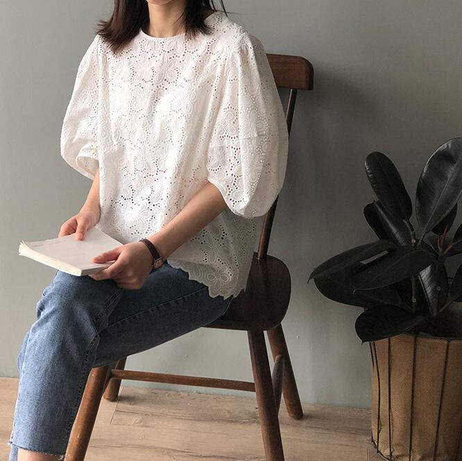 シャツ 五分袖 花柄 フラワー 刺繍 春 夏 ワイド かわいい 大人可愛い きれいめ シンプル カジュアル 大人 上品 おしゃれ かっこいい こなれ感 ラフ ラブリー キュート ガーリー ラウンドネック 袖あり ボリューム袖 パフスリーブ 綿 ホワイト M L 10代 20代 30代 40代 50代 60代 通勤 学生 通学 デート お出かけ 女子会 休日 旅行 着回し 普段使い 重ね着 ファッション コーデ スタイル モテ 送料無料 | Rena 韓国ファッション レディースアパレル