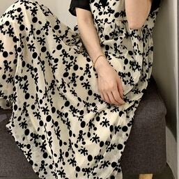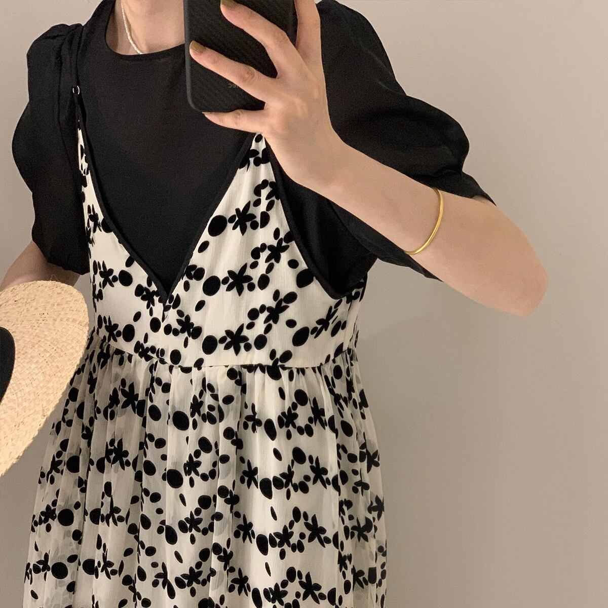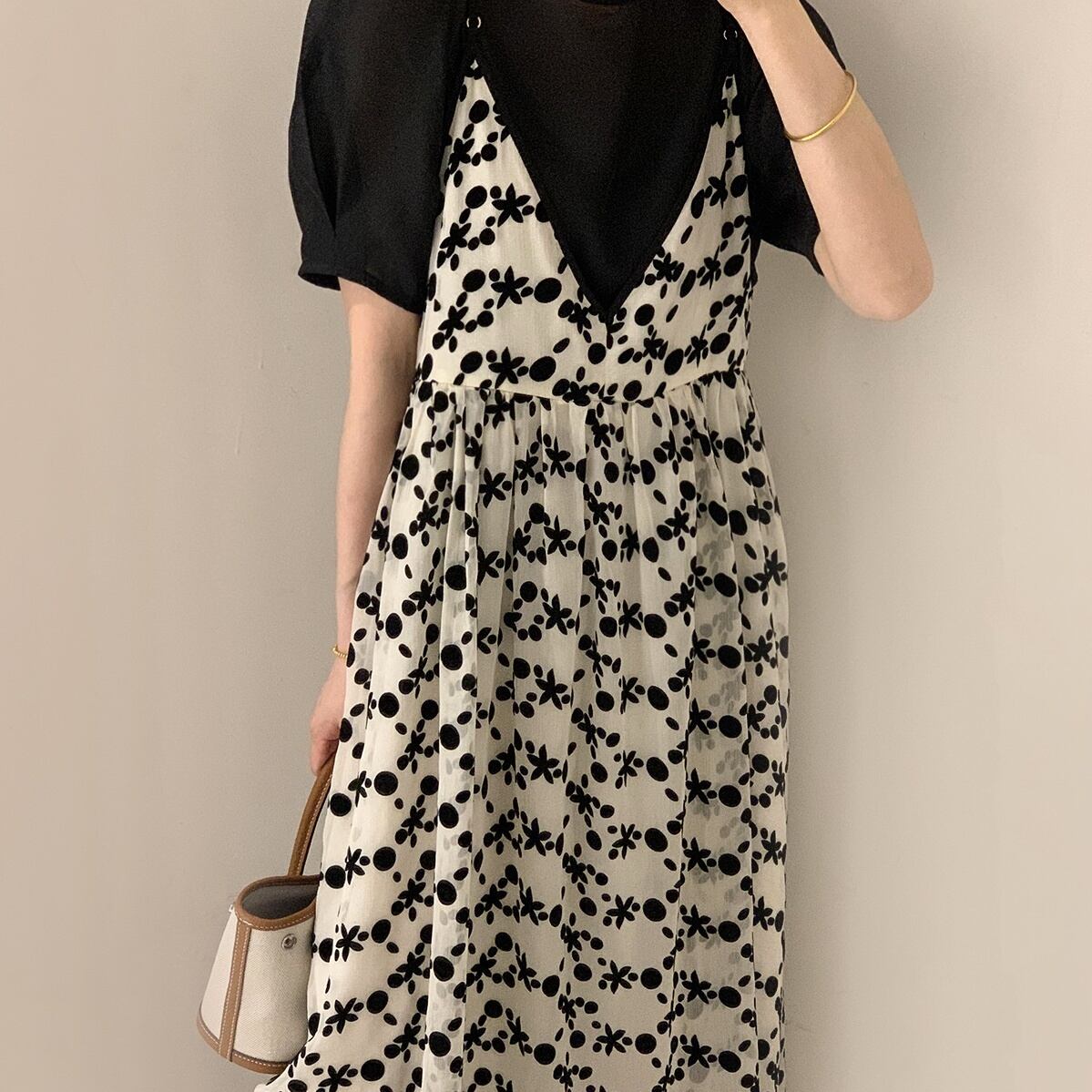 可愛いパフスリーブトップスと印象的な花柄ワンピースのセットです。