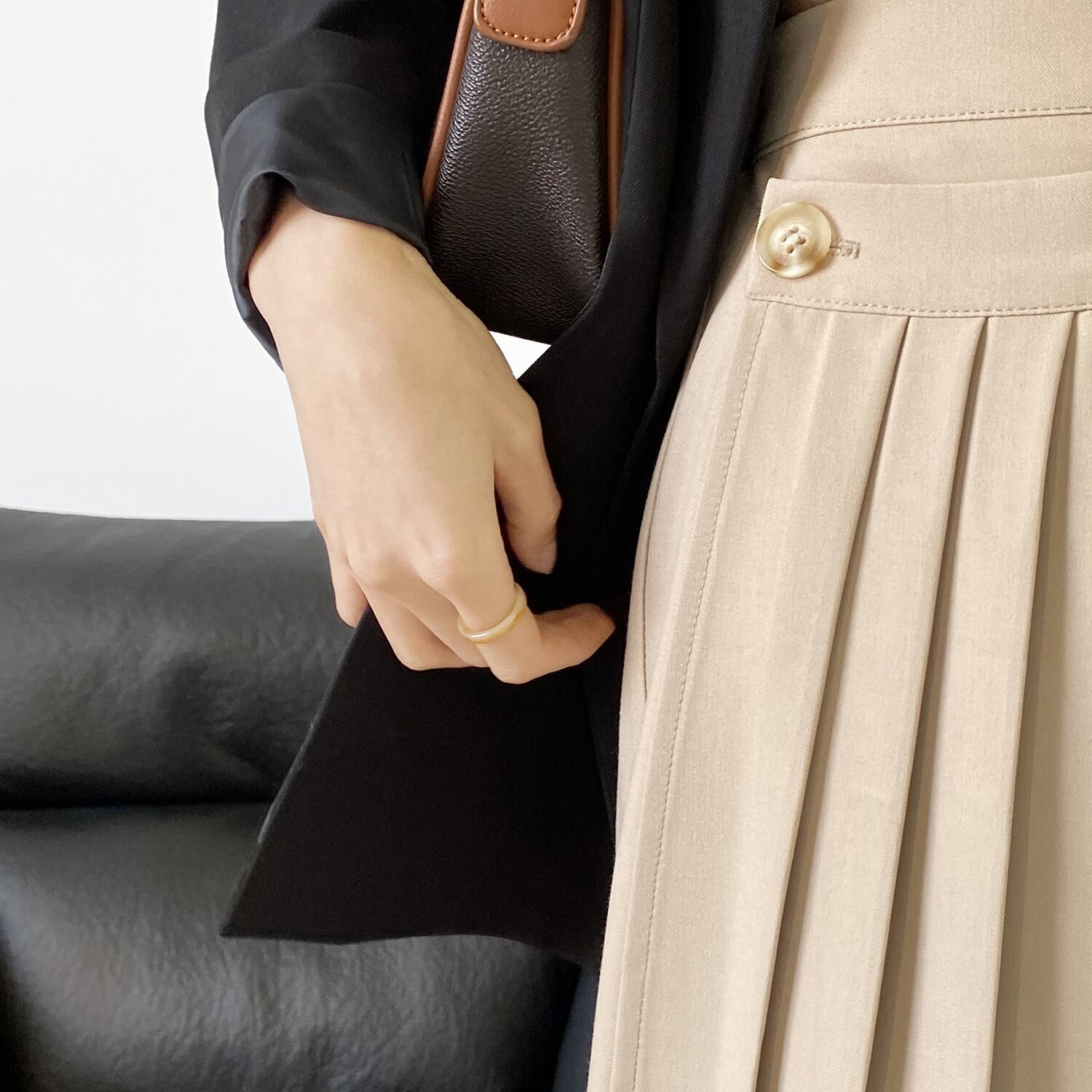 コーディネートをフェミニンに仕上げる太めのプリーツラインが印象的なスカート。