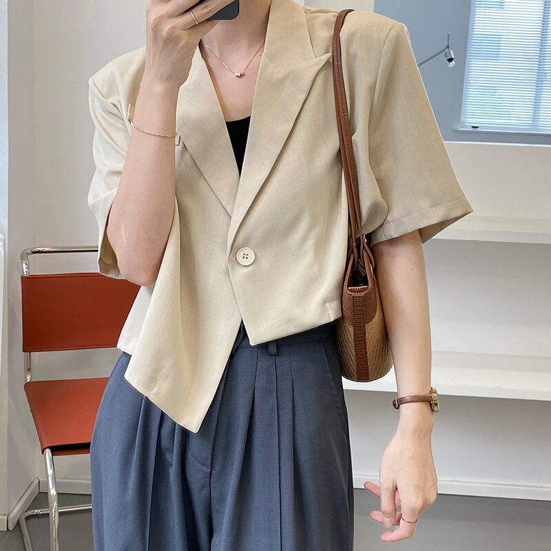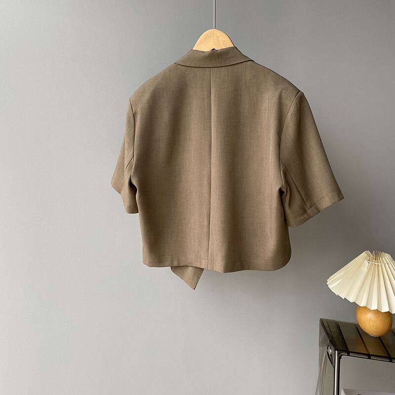 アウター レディース ジャケット ショート丈 半袖 無地 夏 アシンメトリー シンプル カジュアル 大人 上品 おしゃれ お洒落 かっこいい 大人女子 ラフ 個性的 主役級 存在感 袖あり 薄手 茶色 ブラウン ベージュ M L 10代 20代 30代 40代 学生 通学 デート お出かけ 公園デビュー 女子会 休日 着回し 普段使い ファッション コーデ 送料無料 | Rena 韓国ファッション レディースアパレル