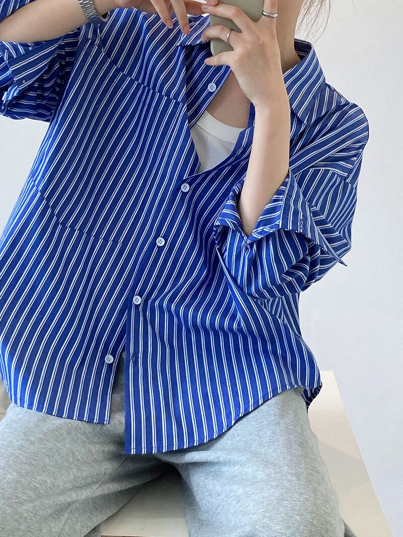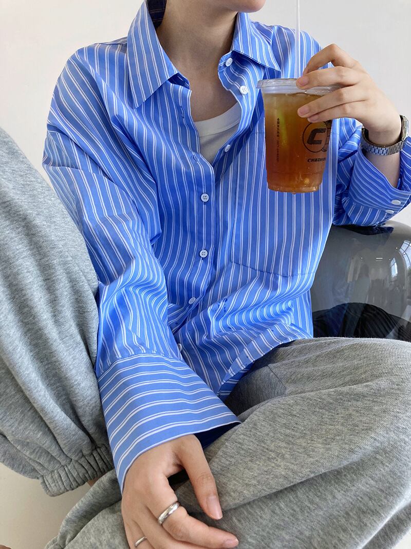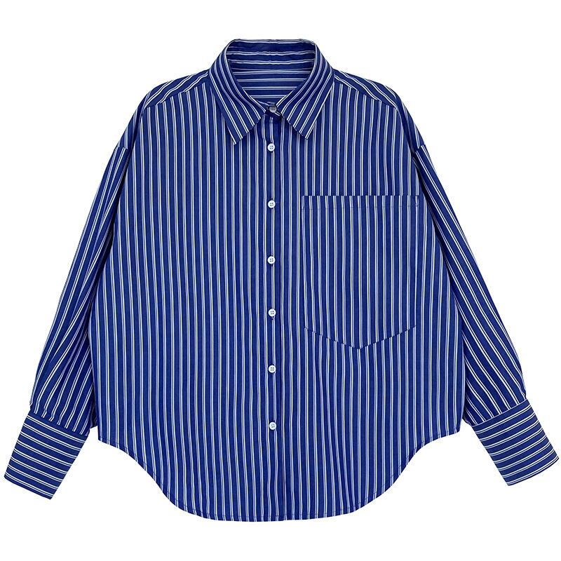 シャツ 長袖 ストライプ 春 夏 秋 冬 ワイド かわいい 大人可愛い きれいめ シンプル カジュアル 大人 上品 おしゃれ かっこいい 大人女子 こなれ感 ラフ メンズライク クール 袖あり ブルー 大人カラー M L 10代 20代 30代 40代 50代 60代 オフィス ビジネス OL 通勤 学生 通学 デート お出かけ 女子会 休日 オールシーズン 着回し 普段使い ファッション コーデ スタイル 楽ちん 体系カバー 送料無料 ゆったり | Rena 韓国ファッション レディースアパレル