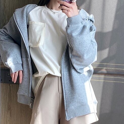 パーカー 長袖 春 秋 フード付き ポケット かわいい 大人可愛い きれいめ シンプル カジュアル 大人 上品 おしゃれ お洒落 かっこいい 大人女子 ラフ キュート クール 存在感 袖あり 灰色 グレー ベージュ S M 10代 20代 30代 40代 女性用 学生 通学 デート お出かけ 公園デビュー 女子会 休日 着回し 普段使い ファッション コーデ モテ 送料無料 | Rena 韓国ファッション レディースアパレル