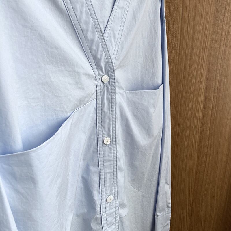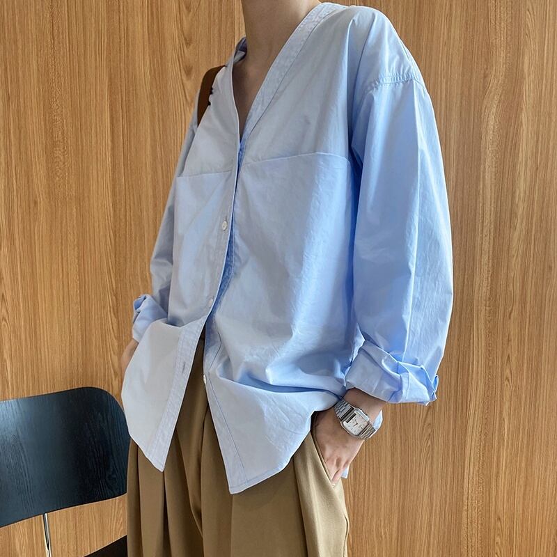 シャツ ブラウス 長袖 無地 春 秋 かわいい 大人可愛い きれいめ シンプル カジュアル 大人 上品 おしゃれ お洒落 かっこいい 大人女子 ラフ クール 存在感 Vネック 袖あり 白 ホワイト 青 ブルー M L 10代 20代 30代 40代 50代 女性用 オフィス ビジネス OL 通勤 学生 通学 デート お出かけ 公園デビュー 女子会 休日 着回し 普段使い ファッション コーデ モテ 送料無料 | Rena 韓国ファッション レディースアパレル