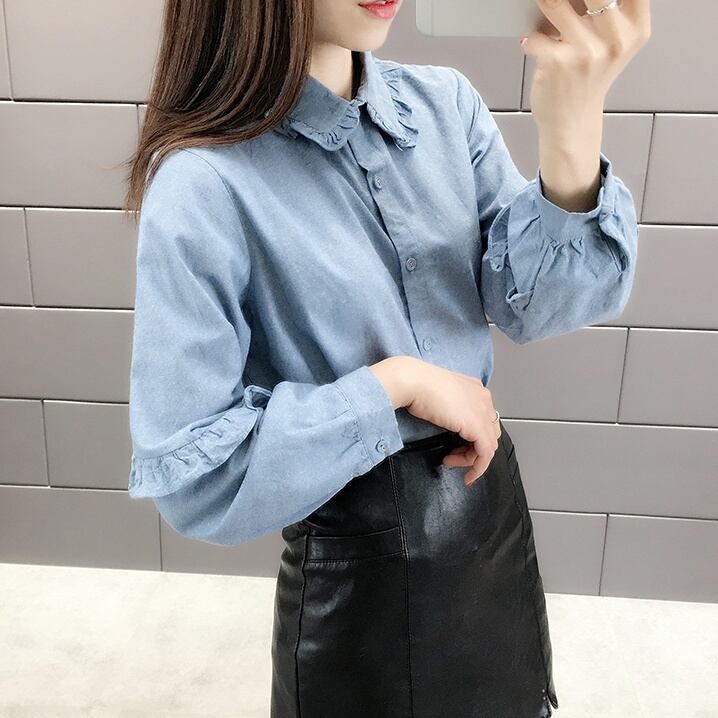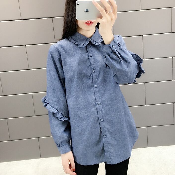 シャツ ブラウス 長袖 春 秋 フリル かわいい 大人可愛い きれいめ カジュアル 大人 上品 おしゃれ お洒落 大人女子 ラフ メンズライク キュート ガーリー 個性的 クール 主役級 存在感 襟付き 袖あり 青 ブルー 灰色 グレー S M L XL 10代 20代 30代 女性用 学生 通学 デート お出かけ 公園デビュー 女子会 休日 着回し 普段使い ファッション コーデ モテ 送料無料 | Rena 韓国ファッション レディースアパレル