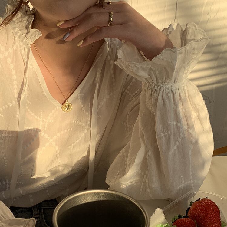 ブラウス 長袖 刺繍 春 秋 フリル リボン かわいい 大人可愛い きれいめ シンプル カジュアル 大人 上品 おしゃれ お洒落 大人女子 こなれ感 ラフ キュート ガーリー エレガント 主役級 存在感 Vネック 袖あり 綿 白 ホワイト フリーサイズ 10代 20代 30代 女性用 オフィス ビジネス OL 通勤 学生 通学 デート お出かけ 公園デビュー 女子会 休日 着回し 普段使い ファッション コーデ モテ 送料無料 インスタ映え | Rena 韓国ファッション レディースアパレル