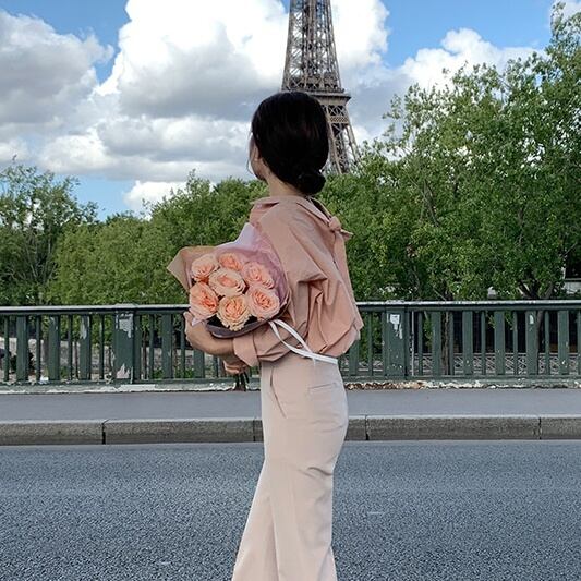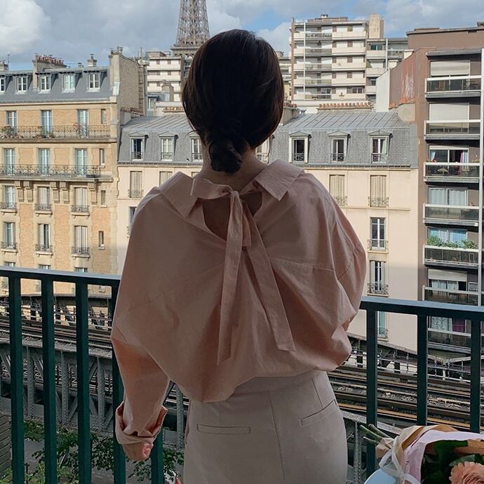 後ろにおおきなリボンがついたバックコンシャスなシャツです。
