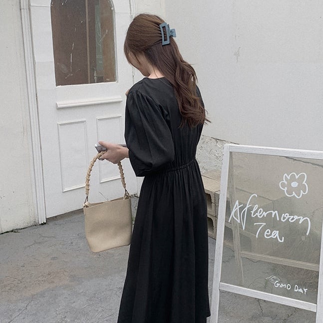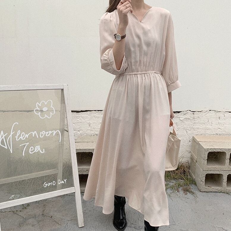 ワンピース ロング丈 七分袖 無地 春 夏 秋 かわいい 大人可愛い きれいめ シンプル 大人 上品 おしゃれ お洒落 大人女子 エレガント 主役級 存在感 Vネック ロング 袖あり 7分袖 白 ホワイト 黒 ブラック フリーサイズ 10代 20代 30代 女性用 学生 通学 デート お出かけ 公園デビュー 女子会 休日 着回し 普段使い ファッション コーデ モテ 送料無料 | Rena 韓国ファッション レディースアパレル