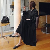 シンプルなデザインに首元はVネック、二段階のプリーツ切り替えがアクセントのワンピースです。