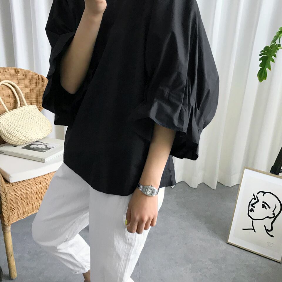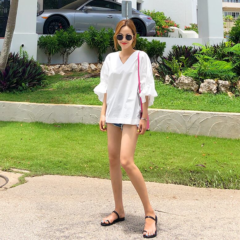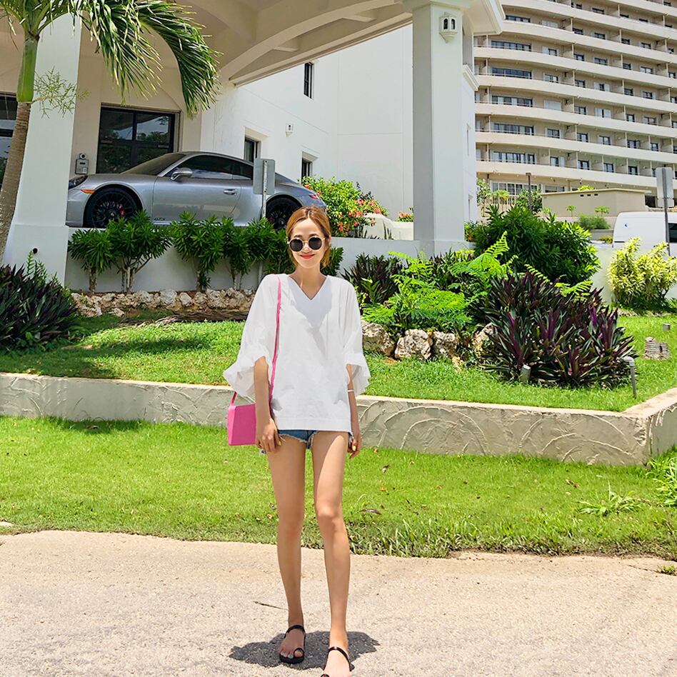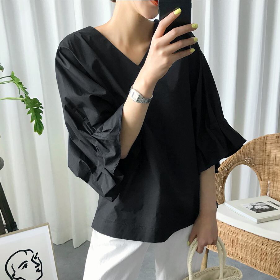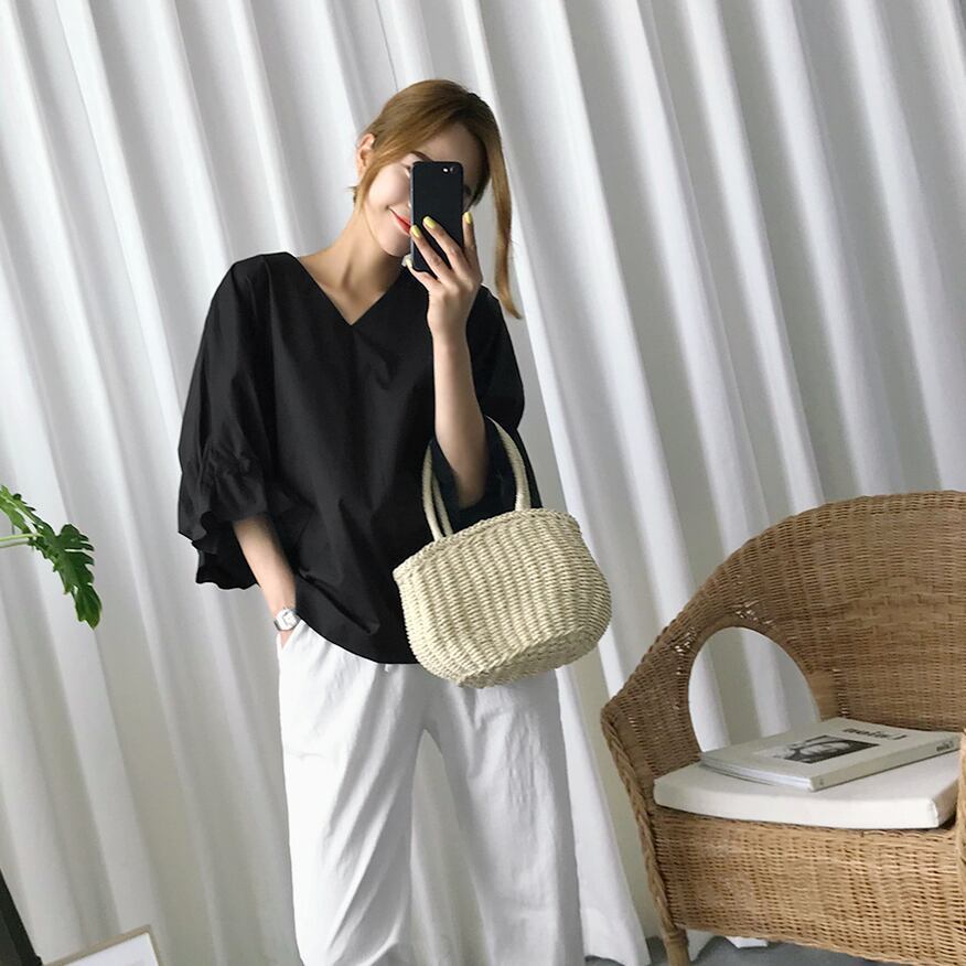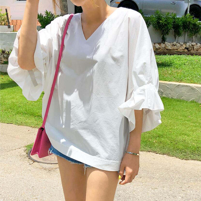 シャツ ブラウス 五分袖 無地 春 夏 秋 フレア フリル 大人可愛い シンプル カジュアル おしゃれ お洒落 大人女子 こなれ感 ラフ ラブリー キュート ガーリー 抜け感 Vネック トランペットスリーブ 白シャツ ホワイト ブラック S M L XL 10代 20代 30代 40代 50代 60代 女性用 オフィス ビジネス OL 通勤 デート お出かけ 公園デビュー 女子会 休日 リゾート 旅行 海 着回し 普段使い ファッション コーデ | Rena 韓国ファッション レディースアパレル