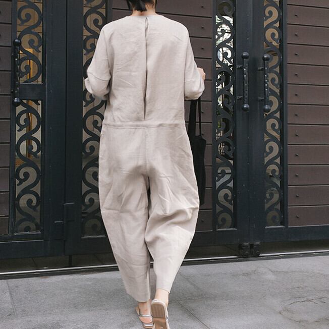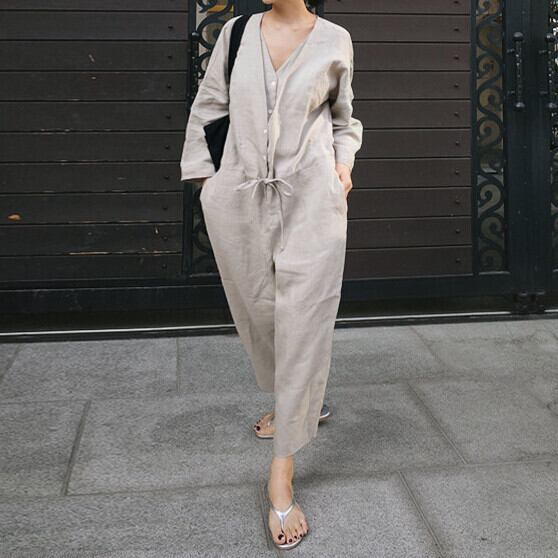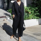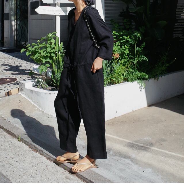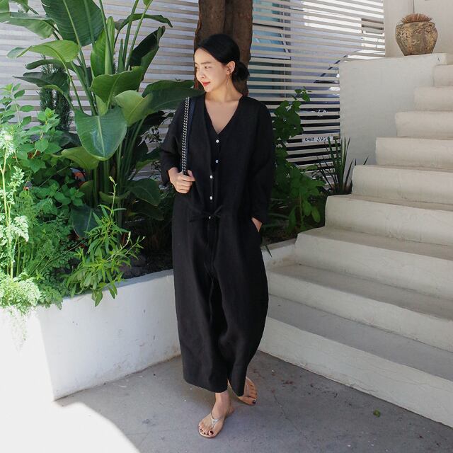 オールインワン ロング丈 長袖 無地 春 夏 ワイド ウエストマーク 前開き シンプル カジュアル おしゃれ お洒落 大人女子 こなれ感 ラフ マニッシュ ルーズ クール モード系 モダン 抜け感 Vネック 襟なし ブラック グレー S M L XL 20代 30代 40代 50代 女性用 お出かけ 休日 リゾート 旅行 海 普段使い ファッション コーデ スタイル 楽ちん | Rena 韓国ファッション レディースアパレル