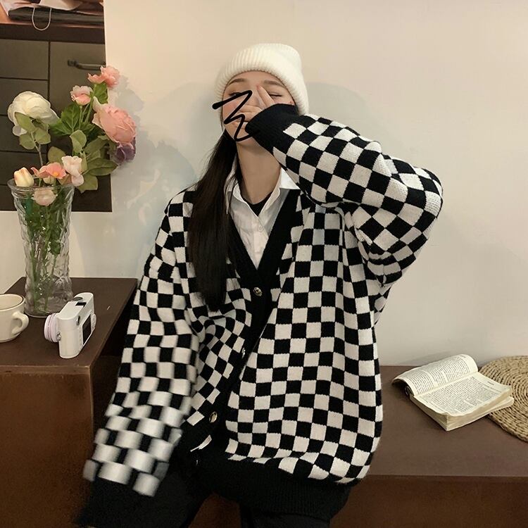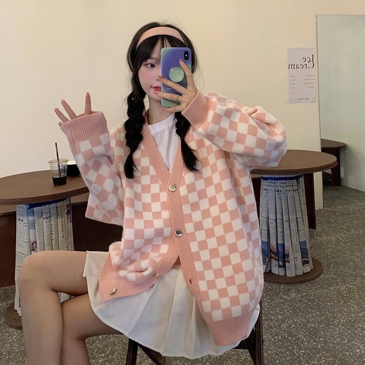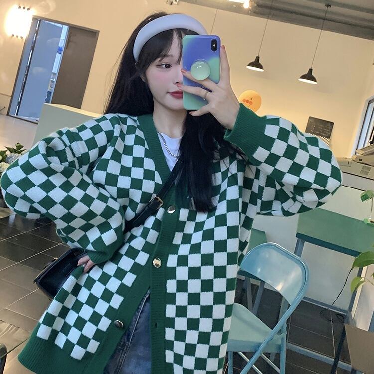 カーディガン 長袖 チェック 秋 冬 前開き かわいい カジュアル おしゃれ お洒落 ラフ ラブリー キュート ガーリー Vネック ボリューム袖 萌袖 ニット ブラック グリーン ピンク S M L 10代 20代 女性用 学生 通学 デート お出かけ 休日 着回し 普段使い 重ね着 オルチャン ファッション コーデ スタイル あったか 暖かい 体系カバー | Rena 韓国ファッション レディースアパレル