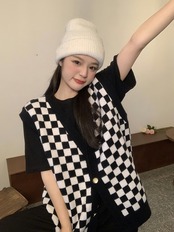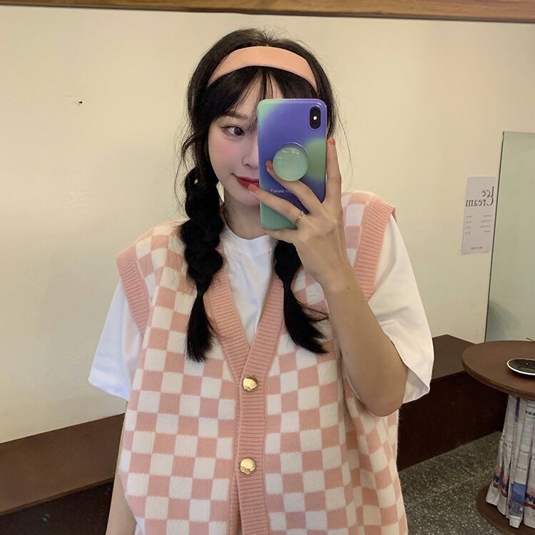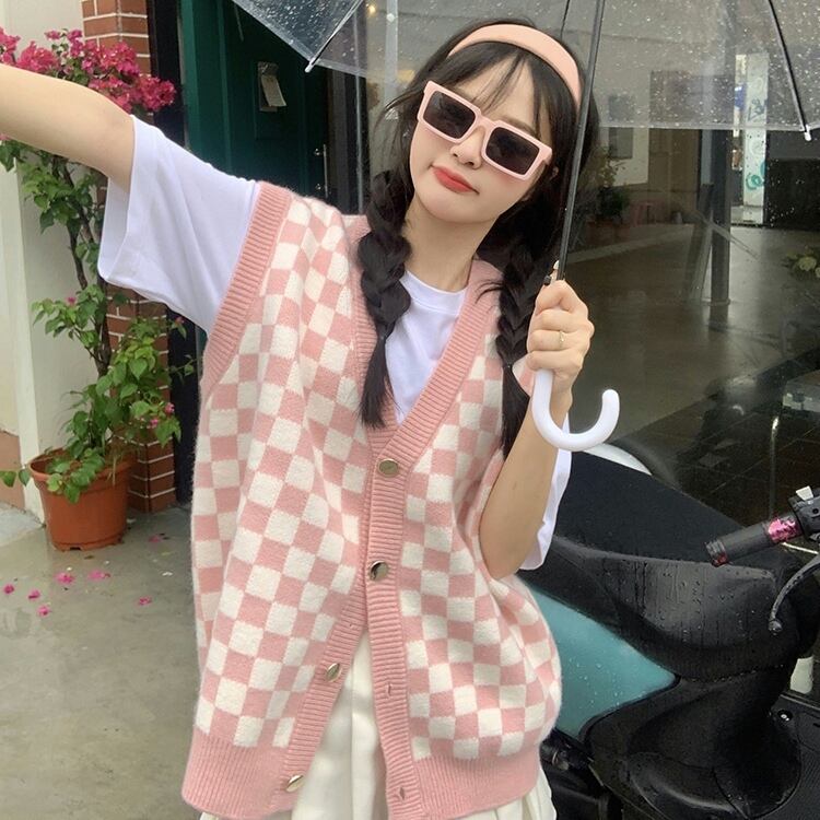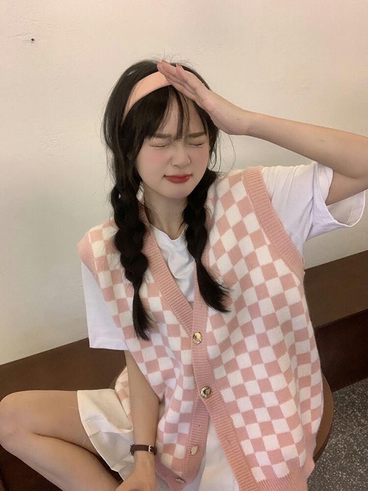ベスト チェック 秋 冬 前開き かわいい カジュアル レトロ ラフ ラブリー キュート ガーリー Vネック ニット ブラック グリーン ピンク S M L 10代 20代 女性用 学生 通学 お出かけ 休日 着回し 普段使い 重ね着 韓国 韓国系 オルチャン ファッション コーデ スタイル | Rena 韓国ファッション レディースアパレル