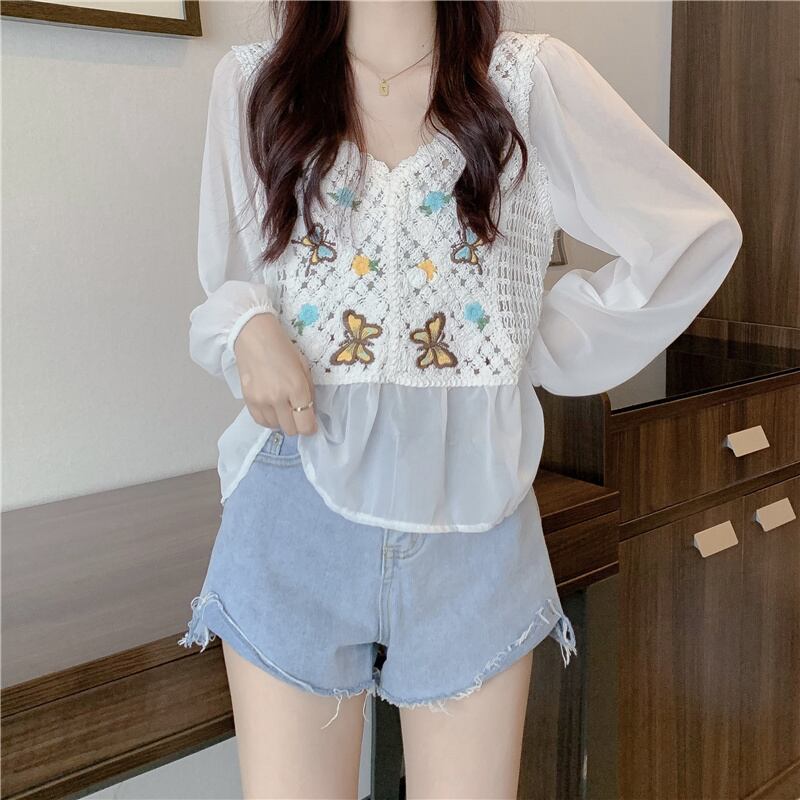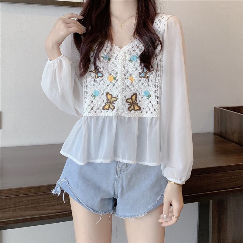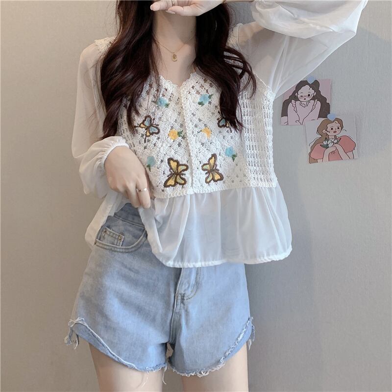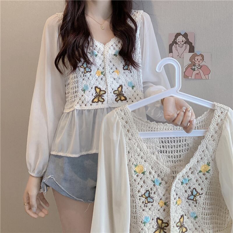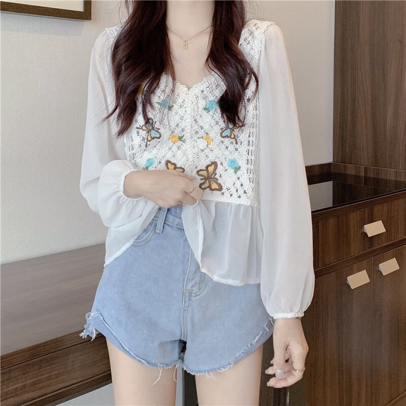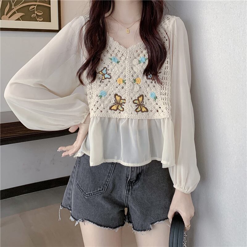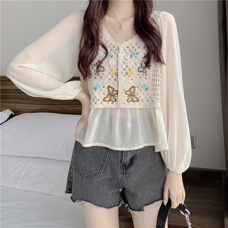 シャツ ニット 長袖 花柄 春 夏 秋 フレア ドッキング レイヤード シフォン 切り替えデザイン クロシェ かわいい 大人可愛い おしゃれ お洒落 大人可愛い ラブリー キュート Vネック 襟なし 袖あり 白シャツ 白 ホワイト ベージュ 10代 20代 お出かけ 女子会 休日 着回し 普段使い 重ね着 ファッション コーデ スタイル 送料無料 | Rena 韓国ファッション レディースアパレル
