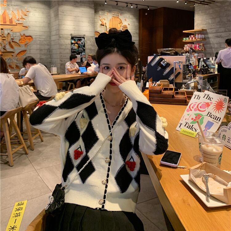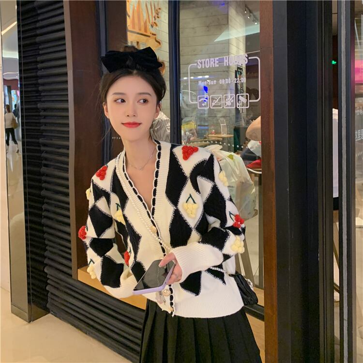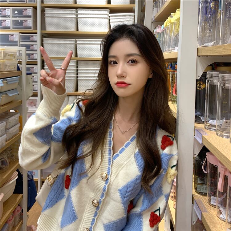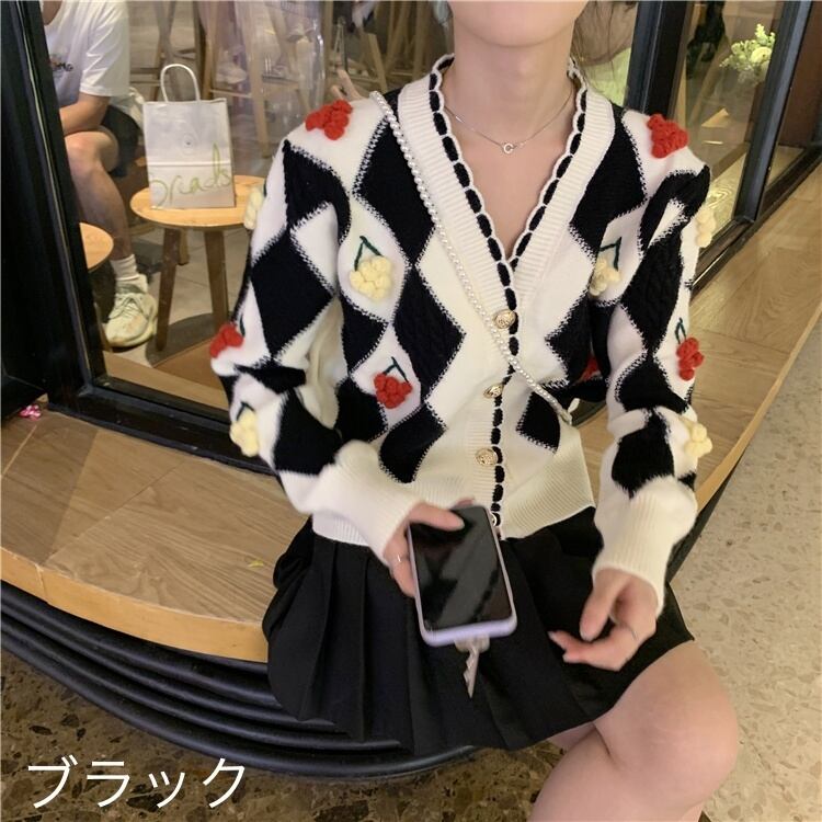 レディース セーター カーディガン 長袖 柄 秋 冬 前開き かわいい 大人可愛い おしゃれ お洒落 こなれ感 ラブリー キュート ルーズ 個性的 主役級 存在感 Vネック 袖あり 黒 ブラック 青 ブルー 10代 20代 デート お出かけ 女子会 休日 ファッション コーデ スタイル あったか 暖かい 防寒 送料無料 | Rena 韓国ファッション レディースアパレル