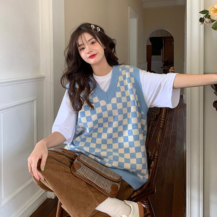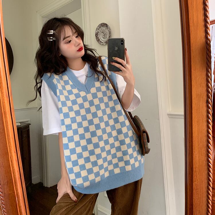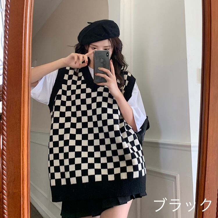 ニット ベスト ノースリーブ 格子柄 秋 冬 ワイド かわいい 大人可愛い カジュアル おしゃれ お洒落 レトロ 大人可愛い 大人女子 こなれ感 キュート ガーリー 個性的 モダン 主役級 存在感 Vネック 袖なし ニット 黒 ブラック 青 ブルー 茶色 ブラウン イエロー S M L 10代 20代 お出かけ 女子会 休日 ファッション コーデ スタイル 送料無料 | Rena 韓国ファッション レディースアパレル