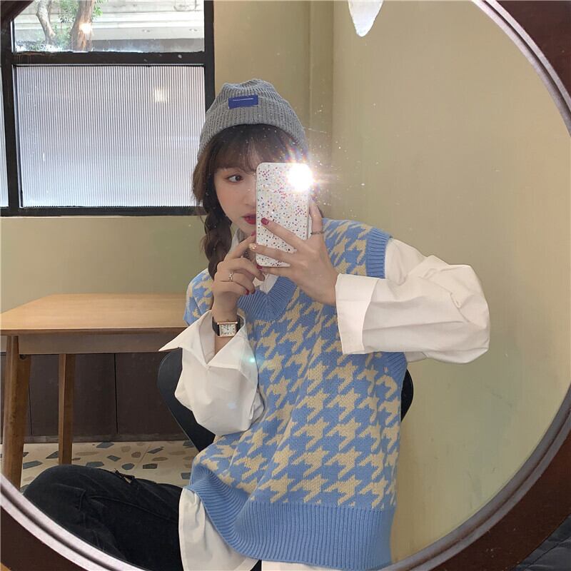 セットアップ ニット ベスト ノースリーブ 千鳥格子 秋 冬 ワイド かわいい カジュアル おしゃれ お洒落 レトロ ルーズ 個性的 存在感 Vネック 袖なし 2点セット 黒 ブラック 青 ブルー 10代 20代 通勤 学生 お出かけ 公園デビュー 普段使い ファッション コーデ スタイル 送料無料 | Rena 韓国ファッション レディースアパレル