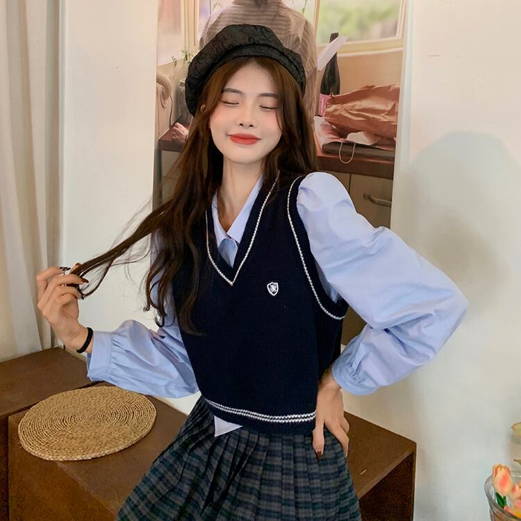 秋に人気のカレッジスタイルを楽しめるベスト、シャツ、スカートの3ピースセットです。