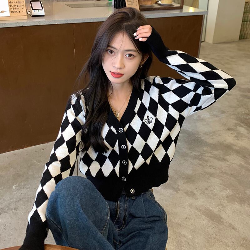 アウター レディース ニット カーディガン ショート丈 長袖 柄 秋 冬 前開き 大人可愛い カジュアル おしゃれ お洒落 かっこいい こなれ感 ラブリー 個性的 主役級 Vネック ショート 袖あり 黒 ブラック 10代 20代 お出かけ 休日 重ね着 ファッション コーデ スタイル 送料無料 | Rena 韓国ファッション レディースアパレル