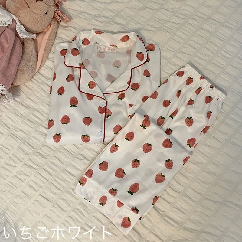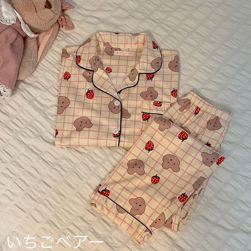 トップスとパンツの2ピースになっていて、全面にいちご柄が施された可愛らしいパジャマです。