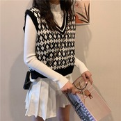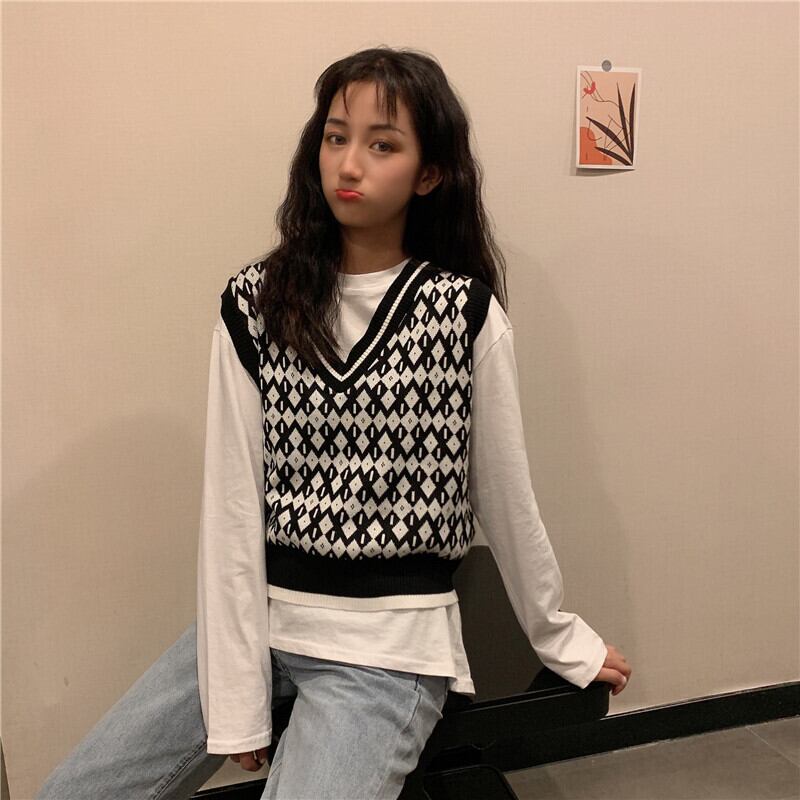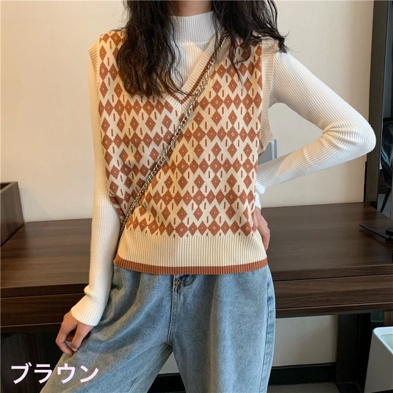 ニット ベスト ノースリーブ 柄 秋 冬 スリム 細身 ストレート Iライン かわいい 大人可愛い きれいめ シンプル カジュアル 大人 おしゃれ お洒落 レトロ 大人可愛い 大人女子 個性的 Vネック 袖なし ニット 黒 ブラック 茶色 ブラウン カーキ くすみカラー 大人カラー ワンサイズ 20代 30代 オフィス ビジネス OL 通勤 学生 お出かけ 公園デビュー 女子会 着回し 普段使い 重ね着 韓国 韓国系 オルチャン ファッション 定番 プチプラ 送料無料 トレンド 流行 インスタ映え | Rena 韓国ファッション レディースアパレル